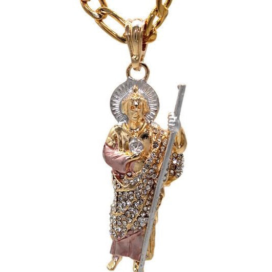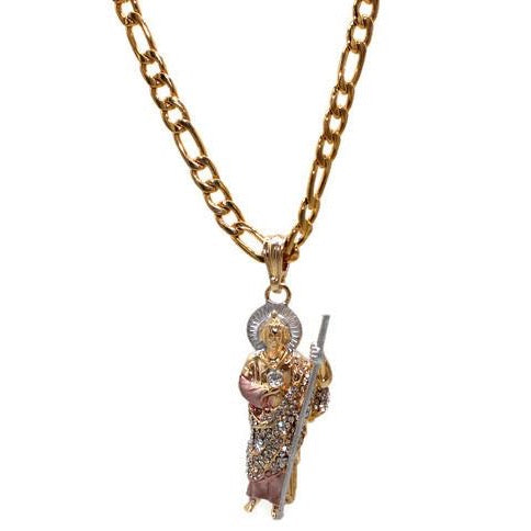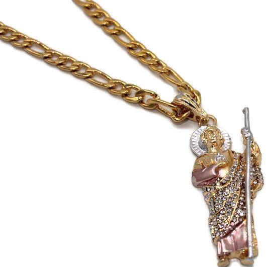 St Jude with Necklace St Jude Pendant - Three Tone with White Stones Includes a 24K Gold Filled Necklace Pendant Measures 2 1/2" Necklace Measures 26"- 5mm Thick San Judas con Cadena Medalla de San Judas-...