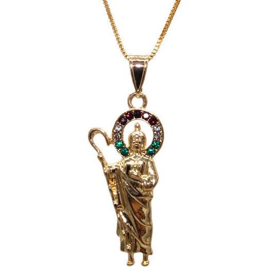 St Jude Necklace St Jude Pendant -Has Mexican color Stones on the Crown Pendant is 24K Gold Filled Necklace is 24K Gold Filled over Stainless Steel Pendant Measures 2" Necklace Measures 22" San Judas con Cadena...