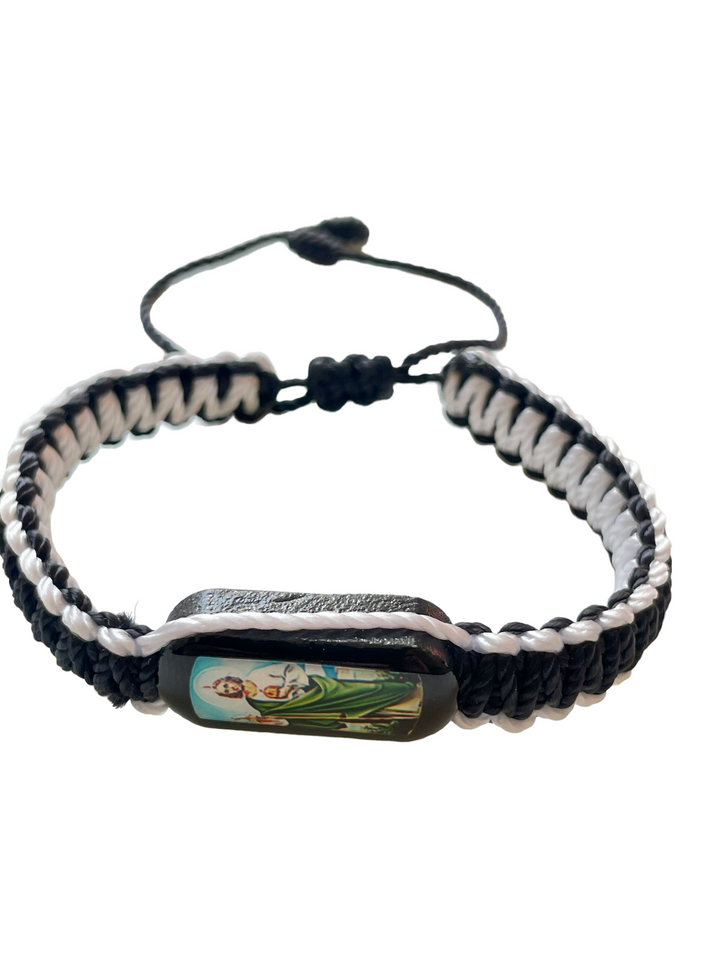 St Jude Reversible Bracelet Handmade Double Side Has St Jude Color Image on Front and Back Wood Charm Black and White Color Adjustable Made in Mexico San Judas Pulsera Hecho a Mano Medalla Doble Tiene la...