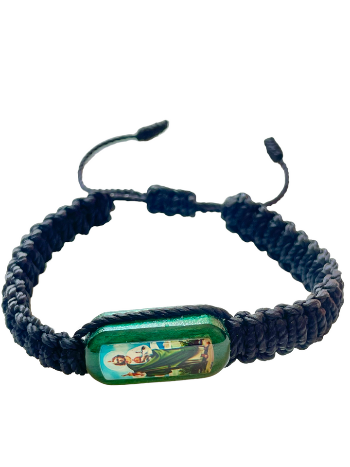 St Jude Reversible Bracelet Handmade Double Side Has St Jude Color Image on Front and Back Wood Charm is Green Color Black Knotted Rope Adjustable Made in Mexico San Judas Pulsera Hecho a...