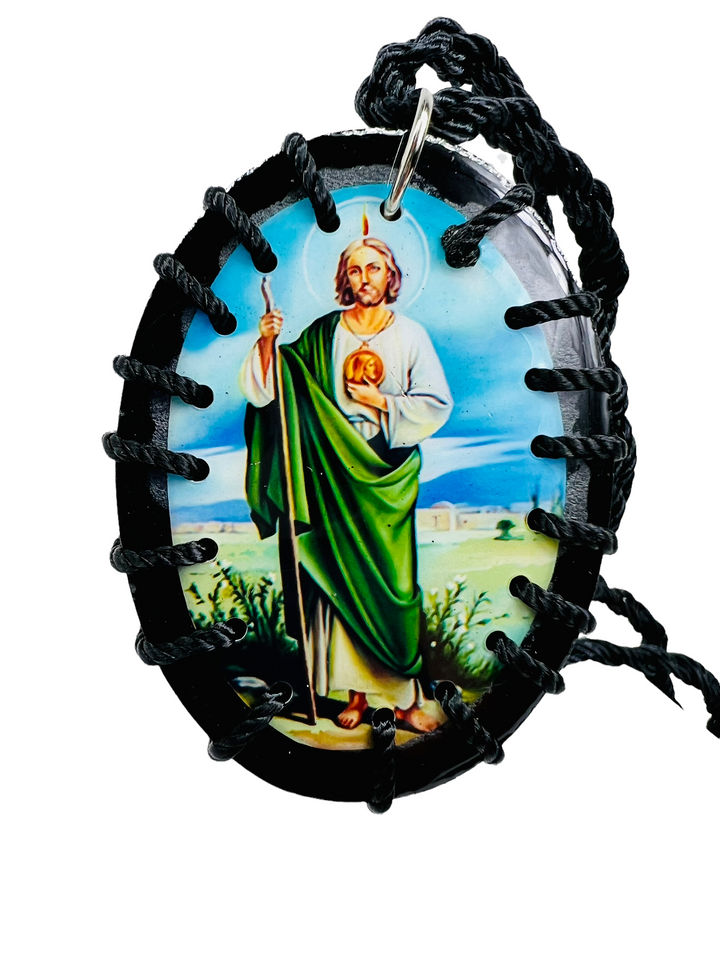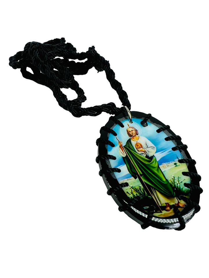 St Jude Reversible Oval Scapular Handmade Wood Pendant Black Color Made with Nylon Knotted Rope Adjustable Pendant has a gold plated image of St Jude on one side and a color image...