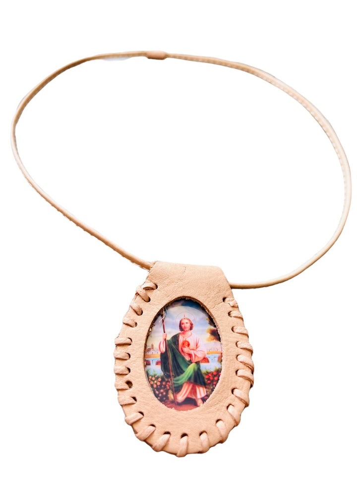 St Jude Scapular Necklace Handmade Leather Pendant Nude Leather Color Made with nude leather necklace Pendant has color image of St Jude Necklace measures 26" Pendant measures 3" Escapulario de San...
