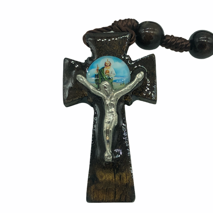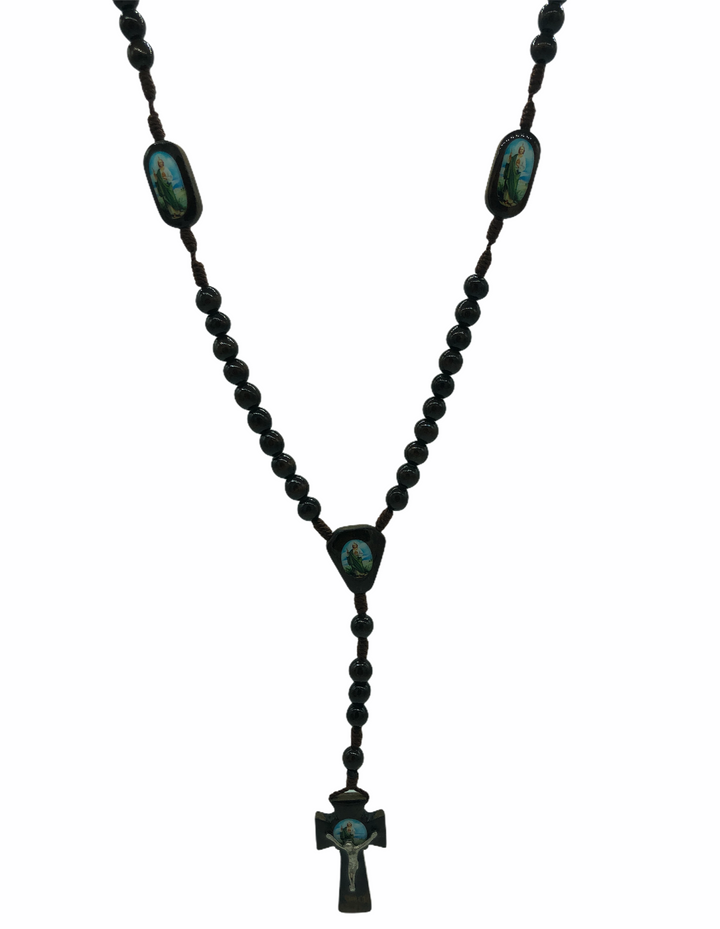St Jude Rosary Handmade Wood Beads, Charms and Cross Brown Color Made with Nylon Knotted Rope Beads are 8mm All Wood Charms have color image of St Jude Cross has a silver...
