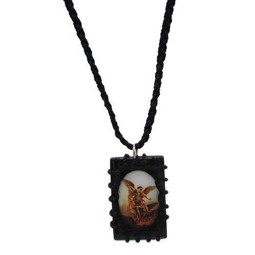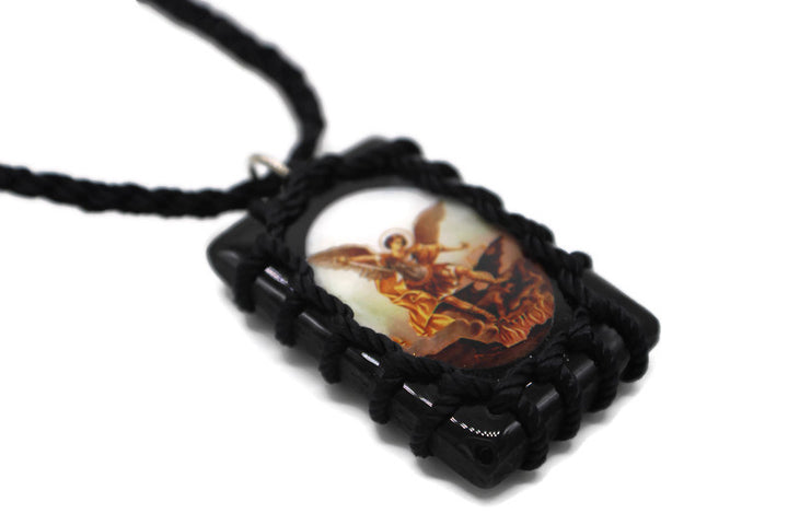 St Michael Archangel Scapular Handmade Wood Pendant Black Color Made with Nylon Knotted Rope Adjustable Pendant has color image of St Michael Archangel on both sides Pendant measures 1 1/8" by 1 3/4"...
