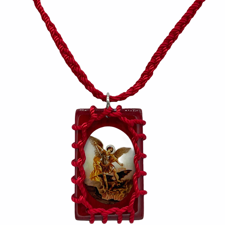 St Michael Archangel Scapular Handmade Wood Pendant Red Color Made with Nylon Knotted Rope Adjustable Pendant has color image of St Michael Archangel on both sides Pendant measures 1 1/8" by 1 3/4"...