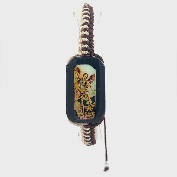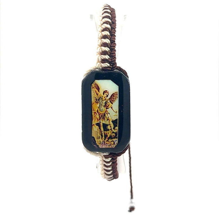 St Michael Bracelet Brown and Tan Knotted Rope St Michael image on Wood Charm Adjustable Handmade Pulsera de San Miguel Hilo color Cafe con Crema Imagen de San Miguel en Medalla...