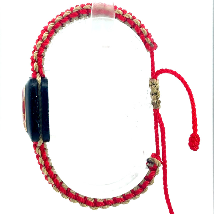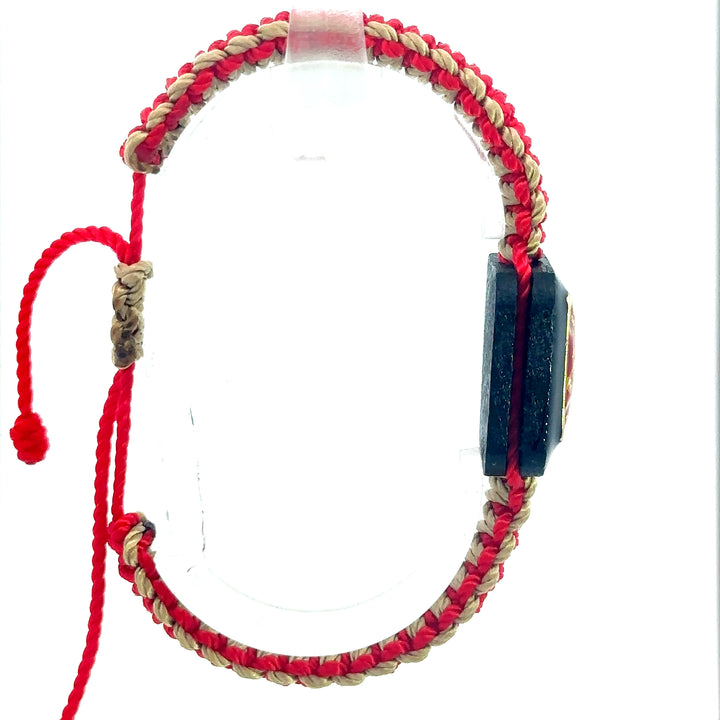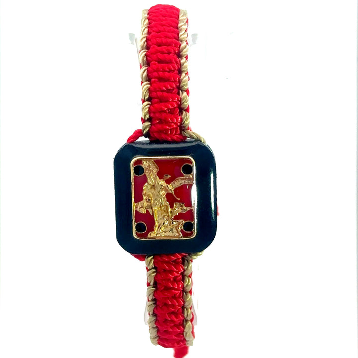 St Michael Bracelet Handmade St Michael Gold Plated image on top a Wood Charm Red and Tan Color Knotted Rope Adjustable Made in Mexico San Miguel Pulsera Hecho a Mano Tiene...
