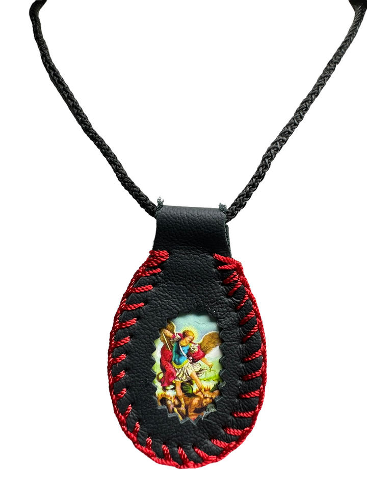 St Michael Scapular Handmade Leather Pendant Black leather color with Red rope trim Made with Black Knotted Rope Pendant has color image of St Michael Adjustable necklace up to 26" Pendant measures...