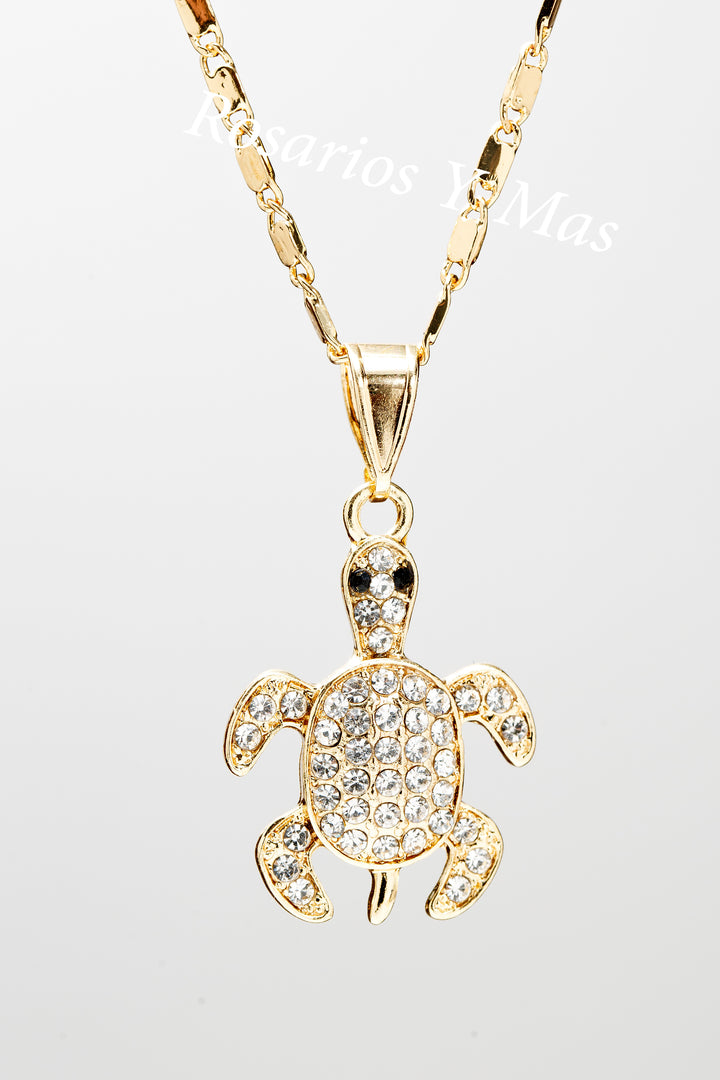 Tortuga Medalla de Tortuga con piedras Blancas Es de 24K Oro Laminado Medalla Mide 1 1/2" Cadena Mide 24" Turtle Turtle Pendant with White Rhinestones Pendant and Necklace 24K Gold Filled Pendant Measures...