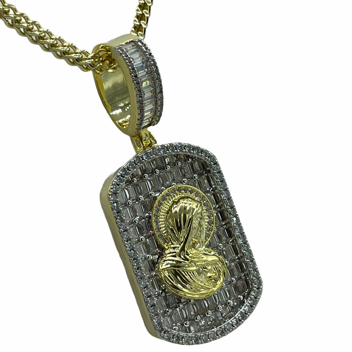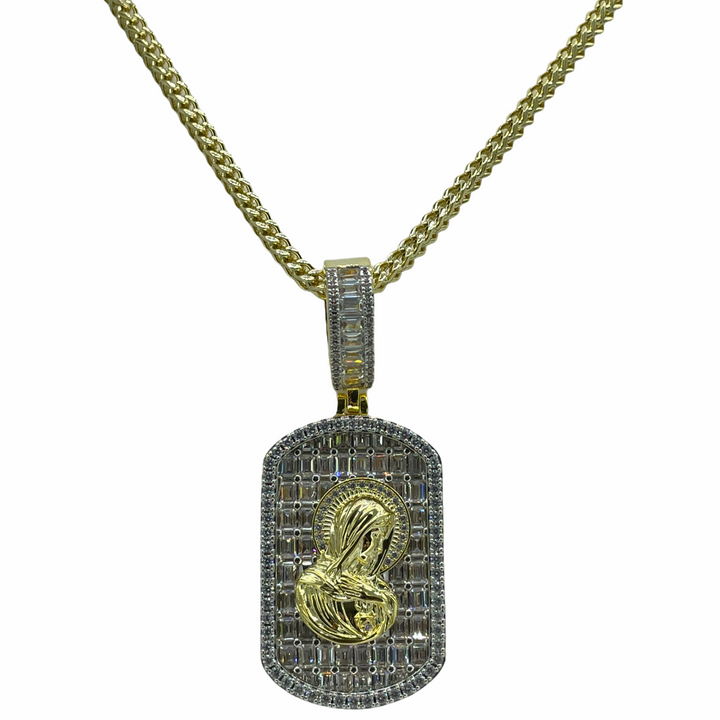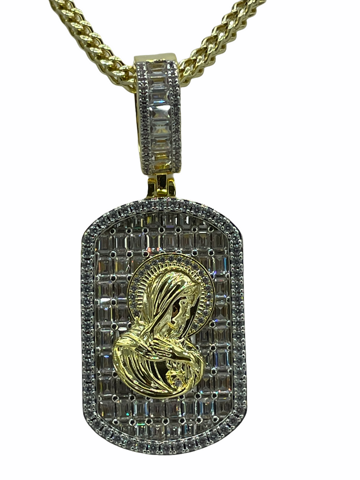 Virgin Mary Virgin MaryPendant Micro Pave Stones Includes Necklace 14K Gold Finish Pendant Measures - 2" Necklace Measures - 26" Virgen Maria Medalla de La Virgen Maria Micro Pave Incluye Cadena 14K Oro...
